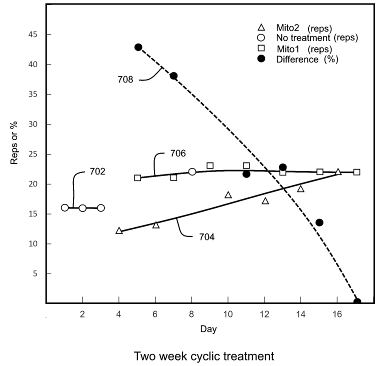 The pre-treatment baseline (702) was 16 reps. With fusion it was higher, and with fission it was lower. With fusion (706), mitochondrial enzymes are shared, thus ATP production and reps were maximum. With fission (704), methylated (or otherwise damaged) mtDNA produce less ATP, thus reps were minimum. The % difference (708) reflects the percentage damaged mitochondria. As they are removed and replaced in iterative fashion, the difference should fall to zero, which in fact it did.